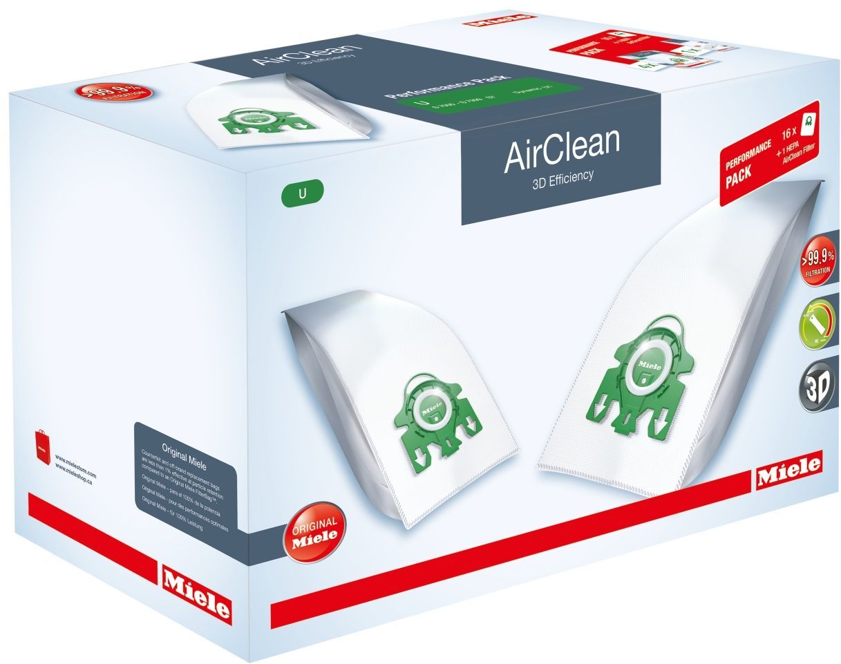 Each Performance Pack contains sixteen genuine Miele FilterBags™ and an AirClean HEPA Filter. Original Miele FilterBags™ and Miele HEPA AirClean filters help to form the advanced Miele AirClean System™, which ensures a dust rentention capacity of more than 99.99%. Counterfeit and off-brand replacement bags are less than 1% effective at particle retention compared to an Original Miele FilterBag™.Read More